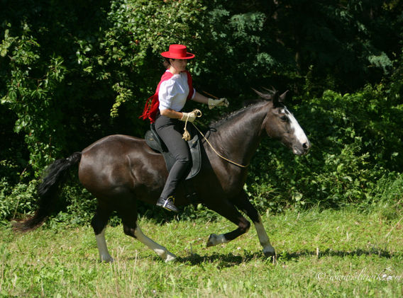 Am Schauplatz des Pferdefestes erwarteten uns schwerst romantische Verhältnisse; ein Reitplatz inmitten tiefsten Nadelwaldes am Ufer eines einsamen Sees, umstanden von einigen grobbehauenen Blockhütten, offene Feuer - an denen bereits fleißig gegrillt wurde, Wackelsteine, Heidelbeeren - sprich: Entspannungsfaktor hoch. Auch wenn sich vorerst dieses unterschwellige Gefühl, jeden Moment könnte ein Grizzlybär aus dem Unterholz brechen, nicht ganz abschütteln ließ, so war zumindest die komplikationsbedingte Anspannung wie verflogen. Elisabeth und Daniela vertraten die IG bereits beim Eröffnungsritt um den Schlesingerteich, dem ein Großteil der ca. 70 anwesenden Pferde, neben den Norikergespannen des Gastgebers auch Tinkerpferde, Friesen der Showtruppe „Moments in Black“, ein Viererzug vor einem Jagdwagen (samt authentischer Dekoration) uvm beiwohnten. Gegen 14 Uhr zeigten die Gäste aus der Region ihre Showprogramme (wobei ins Auge fiel, dass das Waldviertel reittechnisch dem mittleren Westen der USA irgendwie näher steht, als das übrige Österreich) und schließlich ward Reinhild aufs Pferd gehoben und damit der Startschuss für die Vorführung im Damensattel gegeben. Die einzigartige wie interessante Neuinterpretation des Programms wird sicher in die Analen der IG eingehen, zumal sie nicht wiederholbar und nicht rekonstruierbar jedoch durchaus harmonisch und gefällig vom Publikum mit entsprechendem Applaus bedacht wurde. Es mag wohl der Einfluss der „mystischen“ Umgebung Urheber dieser neuen Variante speziell der Kreuzfigur gewesen sein – wie auch immer, den Leuten hat´ s gefallen, und die Abordnung der IG bewies mit dieser Vorführung trotz aller Widrigkeiten, dass allein der olympische Gedanke zählt.
