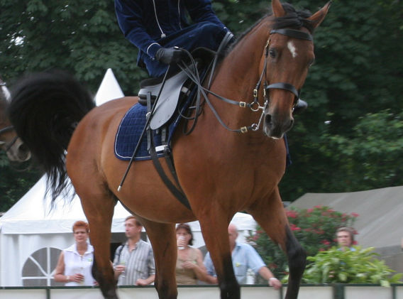 Gleich als erstes von 7 Paaren durften Pandora und Bacchus (erstere unter dem Damensattel) den Bewerb mit einem Dame/Herr Pas de Deux zu Bachs Brandenburgischem Konzert Nr. 3 eröffnen. Zwar konnte der Pilotreiter mittels strengem Ordnungsruf seine Dame darin hindern, traditioneller Weise ganz auf die Schrittarbeit zu vergessen, und es gelang ebendieser auch zwischenzeitlich das Damenpferd von der Unbedenklichkeit diverser wallender Gewänder anderer TeilnehmerInnen am Vorbereitungsplatz zu überzeugen, dennoch schmälerte beides den Gesamteindruck, welcher vom Richterkollegium mit einer technischen Wertnote von 6,5 und einer künstlerischen Wertnote von 7,5, sowie einem vierten Platz in der Gesamtwertung belohnte. Der Sieg ging an ein wunderschönes Rappenpaar als "Phantom der Oper", gefolgt von zwei "Space-Taxis" und am dritten Platz einer "Fußballmannschaft zu Pferd". Weiters tummelten sich "Biene Maja", zwei mystische Gestalten zum Thema "Hexen" und "Blumenmädchen" in der Siegerehrung. Auch wenn das Richterkollegium (Ursula Seipel, Ferdinand Croy) in diesem Bewerb vor keine leichte Aufgabe gestellt waren, so erfreute sich der Pas de Deux-Bewerb bei Publikum wie Teilnehmern großen Andrangs. Abgesehen davon bietet ein solcher Bewerb natürlich hervorragende Rahmenbedingungen den Damensattel offiziell etwas opulenter in Szene zu setzen, als es der graue Turnieralltag ansonsten erlaubt. In diesem Sinne hofft die Verfasserin dieser Zeilen, dass das Vorbild des Schweizerhofes in Traismauer, der den Pas de Deux-Bewerb in Kostüm und mit Musik schon seit Jahren fix in seiner Ausschreibung hat, Schule macht, bzw. dass die Reiterinnen im Damensattel zukünftig solche Chancen auch vermehrt wahr nehmen.